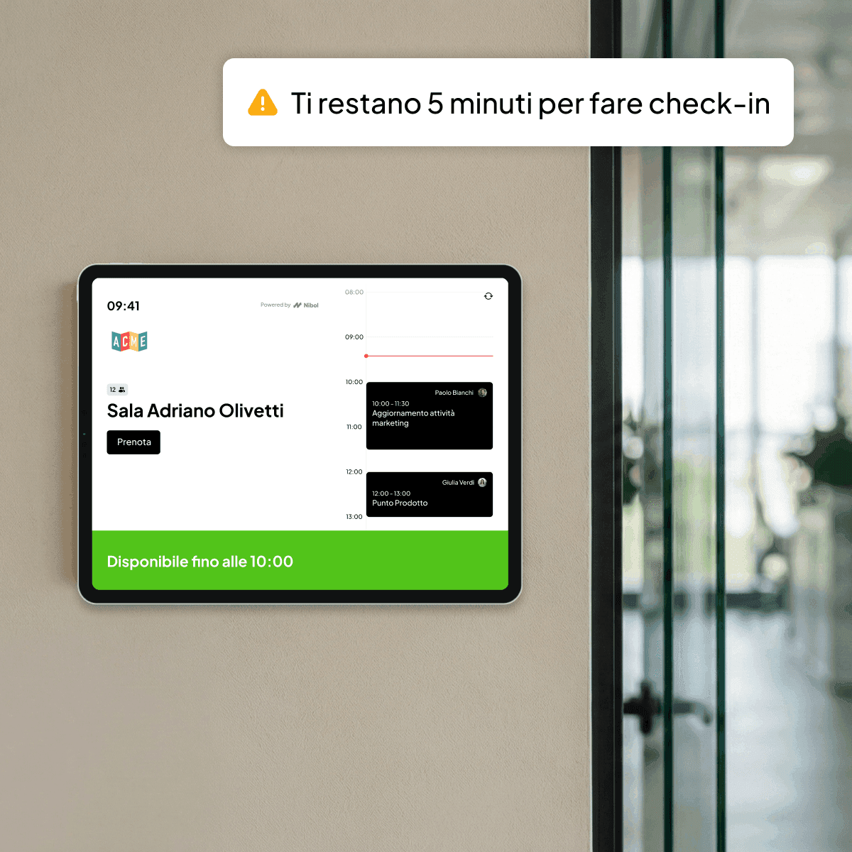 Gestisci e prenota le sale meeting direttamente all'interno di Nibol. Sincronizza con Google e Microsoft e libera la sala in automatico in caso di mancato check-in.